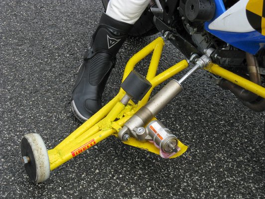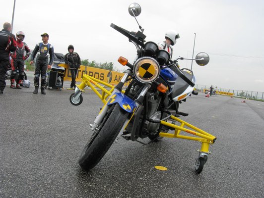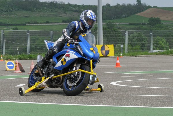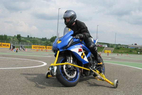 A spéci oldalkerekes motorokat egyébként terven felül is elővették, mivel a progresszív fékezés tanításakor épp esett az eső. Nem annyira, hogy el kelljen halasztani a tanfolyamot, de pont eléggé ahhoz, hogy csússzon az aszfalt. Így, mivel kevesen voltunk – volt rá idő. Eleinte szokni kell, hogy a motorral nem lehet elesni, de megszokható. Legalább ráneveli az embert, hogy ne rakja le a lábát, amíg a motor még mozog. Másnap az oldalkerekes GSX-Rel már a döntés és gázzal történő felállítás volt a lecke.