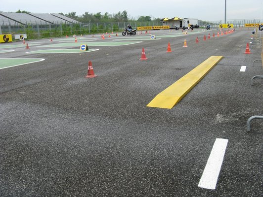 A gyakorlati részeket elképesztően jól kitalálták. Van egy külső kör a pályán, mindenféle trükkökkel, szűk és tágasabb szlalommal, körforgalommal, szűk folyosóval, lépésben poroszkálással – a belső részen pedig az épp aktuális gyakorlat – mondjuk fékezgetés, szűk forduló – megy. Így sorban állás helyett a többi motor körözhet, nem kell unatkozni, kiváló ötlet. Egyre azonban vigyázni érdemes: ha egy GSX-R kerül eléd a sorban, az tuti agyonvágja a szűk szlalomodat, mert alig bír elfordulni a szűk helyen. Érdemes hát jól helyezkedni, vagy megtanulni láblerakás nélkül várakozni. Ezt később még triálmotorral is kipróbálhattuk.