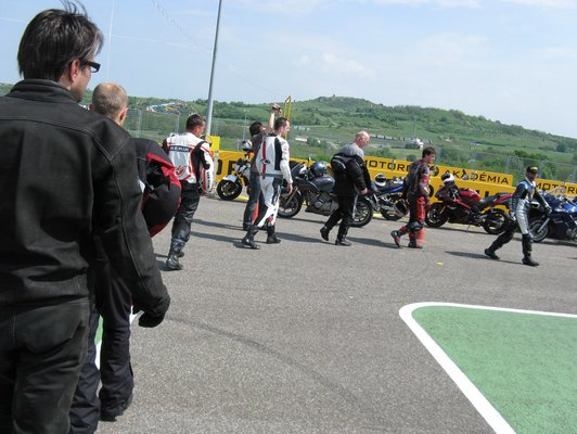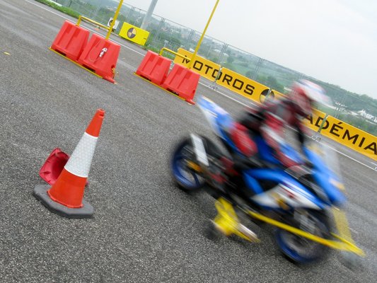 Bár a képzés a Hungaroringen van, ez csupán azt jelenti, hogy egy F1-es pálya mellett van az az aszfaltdarab, amit a motoros képzésekre használnak. Ugyanezt Bugacpusztán is csinálhatnák, de ott közben nem köröznek mindenféle Porschéval és Ferrarival gazdag svájci nyugdíjas fogorvosok. Mi tagadás, ez elég jó alaphangot ad az egésznek.