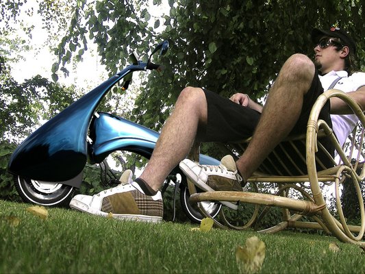 A váz és a karosszéria szénszálas kompozit, amelynek kialakítása lehetővé teszi, hogy utazóbőrönd méretűre összehajtható és húzható legyen – így parkolóhelyet nem igényel. A hajtás elektromos agymotoros, de pedál-generátor is helyet kap a gépecskén.