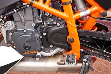Ez nem egy egyszerűen felfúrt, tuningolt 690 Duke-blokk: teljesen más az egész forgattyús mechanizmus, a főtengely, a vezérműtengely; gyakorlatilag a váltó az egyedüli alkatrész, ami megegyezik. A legfontosabb különbség, hogy az R-be szerelt motorikus alkatrészek sokkal nagyobb mechanikai igénybevételt is kibírnak. Nem tudni, hogy az eredeti versenymotort hány lóerősre tervezték, de vélhetően erősebb lett volna, mint a most szériában gyártott hetvenlovas változat: öt lóerőért nyilván nem csapnak ekkora lakodalmat a fejlesztő részlegen.