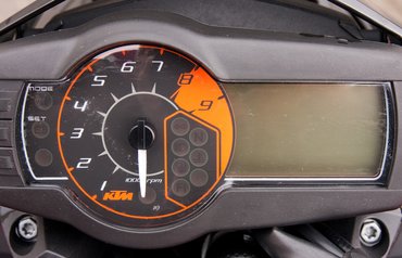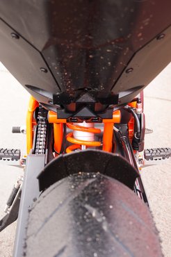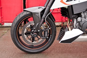 A többi változás inkább csak jelzés értékű. Ideje volt megszakérteni a korábbi modellek beázott műszerfalát: az újak állítólag már szépen szigetelnek – ezt a fejlesztést az összes LC4 alapú motor megkapta. Narancssárga a váz és a központi rugóstag rugója, amitől szívinfarktust egyik KTM-es sem kap, hiszen ez mindegyik R verziónál ilyen. Az első kerék feletti sárvédőt nem műanyagból, hanem karbonból gyártják: így még simán rákenődhet két darab, rommá hízott cserebogár a felnire, hogy a sima verzió rugózatlan tömegével pariban lehessünk. De tény, hogy az első kerék visszajelzései ettől is javulnak. A belső villaszárak megkapták a szokásos TiAIN felületkezelést, ez a két teleszkópszár közti súrlódást csökkenti, illetve maga a futómű-beállítás is sportosabb.