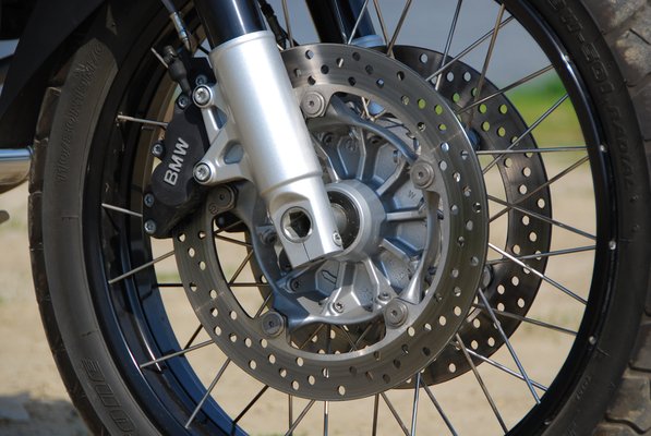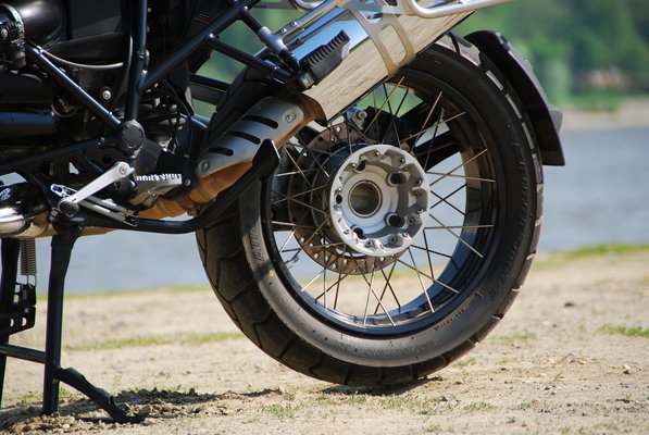 Nézegettem ezt a furcsa óriásrovart, próbáltam vele barátkozni. Küllősek a kerekei, mint az enduróknak általában, de a küllők feje egészen kint van a felnik szélén, annyira, hogy a végek látszanak a gumik mellett. Kardánhajtás, persze, minden BMW ilyen, meg féloldalas lengőkar hátul, tehát a kerékcsere alig probléma.