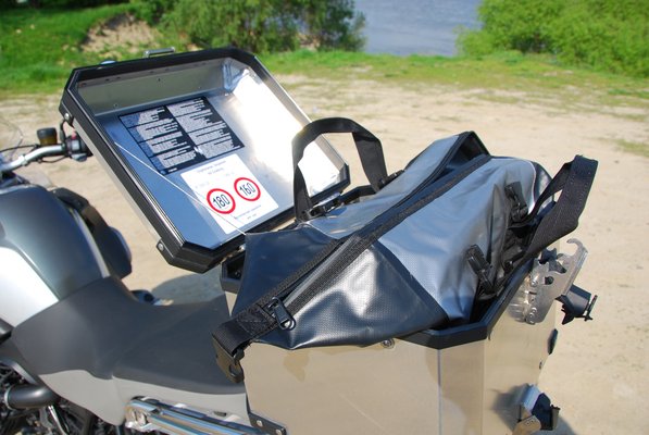 Van a motor farára szerelt fémretikülben is egy kis blikkfang: a vízmentesen záródó dobozban táska lakik. Ezt felviszed a lakásba, megtömöd, és ha be tudod cipzárazni, akkor vissza is tudod tenni majd a dobozba. Zseniális a kidolgozása, nagyszerű az ötlet is, de ha Endre barátomnak nem betegszik meg a barátnője, és emiatt nem kocsival jönnek a túrára, egy ruhában húzzuk végig a háromnapos hosszú hétvégét. Hiszen a GS-nek még a tankja is műanyag, ezért a mágneses tanktáskámat se tudtam volna feltenni.
