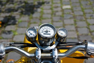 A három kerek műszer igazán klasszikus, ha nem enné a korrózió, akár még szépnek is nevezhetném. A bal oldali a töltést, a középső a tempót, a jobb az üzemanyagszintet jelzi. A benzin mennyiségét nagyban befolyásolja a nyereg és a csomagtartó között található tanksapka – az Amerigóé elveszett, gazdája egy bépipapis üveg fedelével pótolta. Ötletnek nem rossz, de a valóságban nem működik: már a garázsban azzal játszottam, hogy a félig a műanyagok alá csúszott kupakot kihalásszam, és valahogy visszanyomjam.