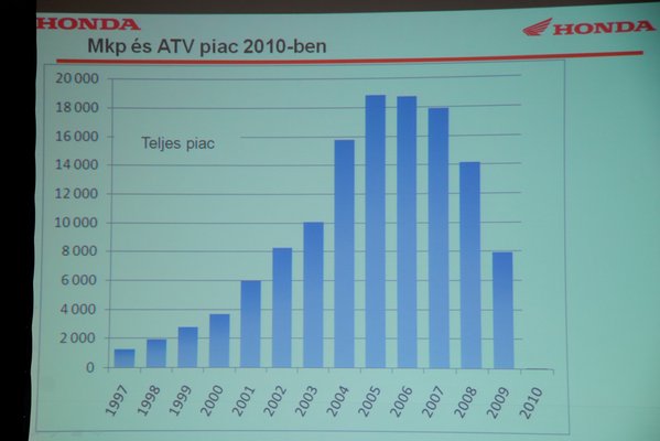 Ennek köszönheti a Honda Magyarországon, hogy bár a középkategóriás vevők tőlük is szinte teljesen eltűntek, a Honda Hungary ha visítva is, de nyereséges tudott maradni. Ezzel pedig egyedül áll a piacon. Szloboda Tamás értékesítési vezető arra is kitért, mennyire nem egészséges dolog ez a fajta piaci egyeduralom: senkinek nem tesz jót, ha nincs kivel versenyeznie. A magyar motorpiac 2006-ban volt a csúcson, 19 198 eladott járművel, aztán lassú csökkenés következett, majd jött a válság és a szabadesés. És nem elég, hogy akkorát zuhant (évi 18 ezerről 8 ezer alá), még az első válságévhez képest is folytatódott a visszaesés.