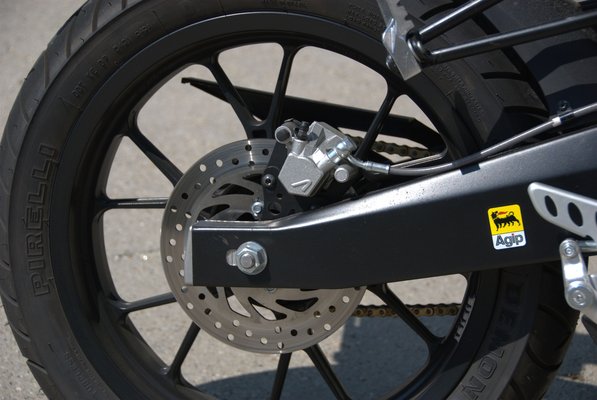 A 300-as tárcsához passzintott, kétdugattyús radiális féknyereg hibátlan. Erős és adagolható, amiben szerepet játszik a fémfonatos fékcső is. Dicséretes, hogy az 1,2 milliós (regadóval, áfával) Derbire ilyet tesznek. Pontosabban elszomorító, hogy az olyan sokmilliós cuccokra, mint például a Vmax, miért nem tesznek gyárilag.