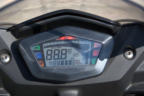 A komolyabb előzéseket kétszer is meg kell gondolni, egy nyergesvontató-szerelvény lehagyása félelmetesen hosszú idő. Ezen az sem változtatna, ha egy jól beállított gép lenne alattam: a négyütemű 125-ösök tudása véges. Ennek tükrében az LCD-panelbe ágyazott köridőmérő több, mint mókás.