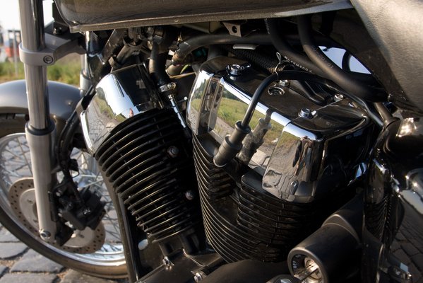 Arra felkészítették a VT750-est, hogy a piros lámpánál ne legyen égő. Itt ugyanis a motorosok úgy vizslatják a másik gépét, mint a férfi zuhanyzóban, hogy kinek mekkora. Viszont a 745 köbcenti, az egyértelműen kicsi, ezért a Shadow hengereit kissé feltupírozták. Igaz, amúgy is OHC, de a vezérműtengelynek nem kell ennyi hely. Nem baj, tényleg jól néz ki, azt, hogy hengerenként három szelep és két gyertya van, a kutyának sem kell tudnia. Igaz, csak 44 lóerő, ezzel még a japán customok között is a legkisebb teljesítményű, a Suzuki 800-asa, a Kawa 900-asa megvan akár 50-55 ló is.