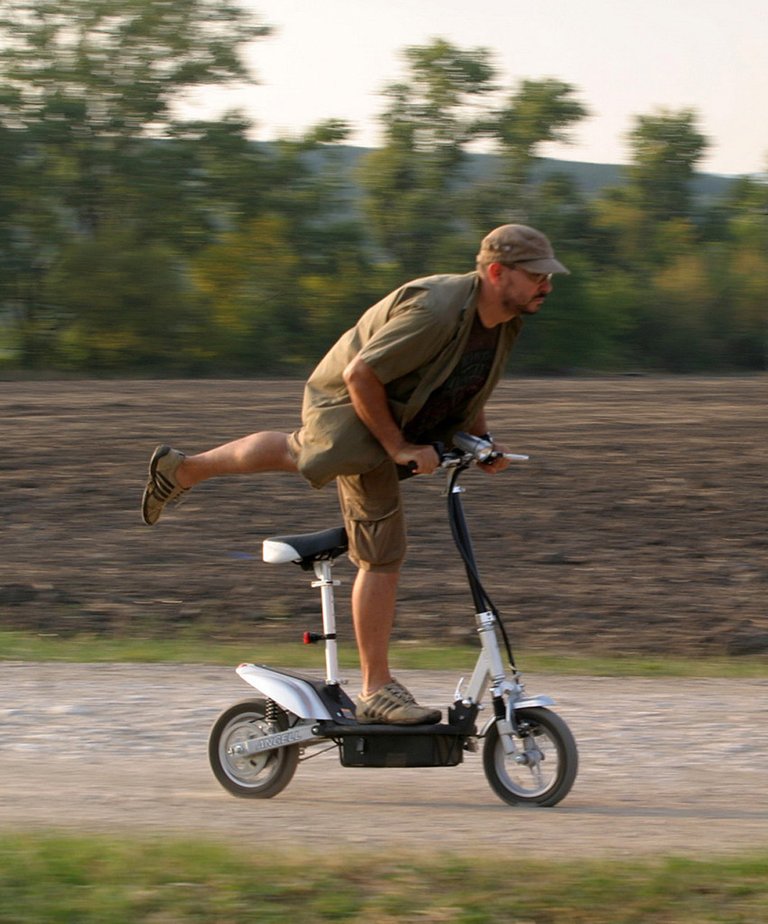 Ennek ellenére sem fog elterjedni mifelénk. Mari néni és Bözsi néni nem ilyet hozattak a barkácsáruházból, hanem elektromos biciklit, ami nagyobb, masszívabb, kicsit tán erősebb is, és ami a fő, pont olyan, mint a hagyományos bringa, csak magától is megyen, amíg el nem fáradnak az elektronok. Jolán ángyom meg egyenesen villanyrobogót vett, azzal menőzik, az majdnem olyan dizájnos, mint egy benzinmotoros robogó. Lassabban megy ugyan, de olcsóbban, és mindkét tény jobb kedvre deríti Jolán ángyomat.
