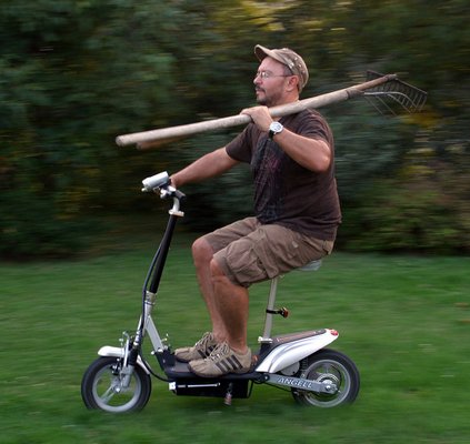 A bevásárlótáskát a kormányra akaszthatjuk, vagy a lábunk közé szoríthatjuk, ez a dolog működik. Továbbá mehetünk vele hivatalba helyi adót befizetni, körzeti orvoshoz vérnyomáscsökkentőt íratni, rokonokhoz tökgyalut kölcsönkérni, ilyen célokra az elektroller teljesen megfelel. További előnye, hogy a konstrukciójából adódóan az üzemeltetése fillérekből kijön. Nem kell bele se motorolaj, se fékolaj, se gyújtógyertya, se légszűrő, a fogazott ékszíj évekig kibírja, nincs rá súlyadó és kötelező biztosítás, és a villanyszámla se lesz sokkal magasabb, ha nyáron ezzel kujtorgunk a környéken.