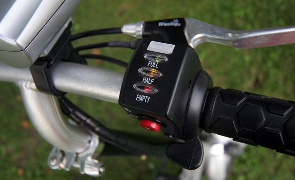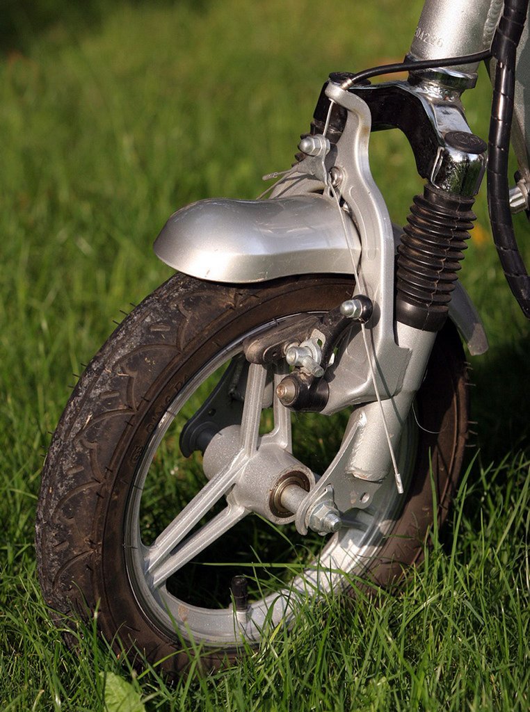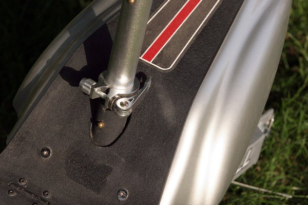 A felépítése és a teljesítménye nem sok jót ígért, a végtelen egyszerűsége viszont tetszett. A kerekek nagyon kicsik, ámde könnyűfém felnisek (!), közöttük, a vázban kialakított fészekben trónolnak az akkumulátorok, jó alacsonyra lehúzván a súlypontot. Az első keréken a bicikliken megszokott V fék, a hátsón egy szalagfék dolgozik. Mindkét kerék rugózott, hátulra még mutatós tekercsrugók is kerültek. A masszív kis gumikon kellően mélyek a barázdák.