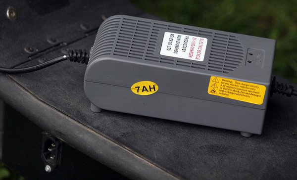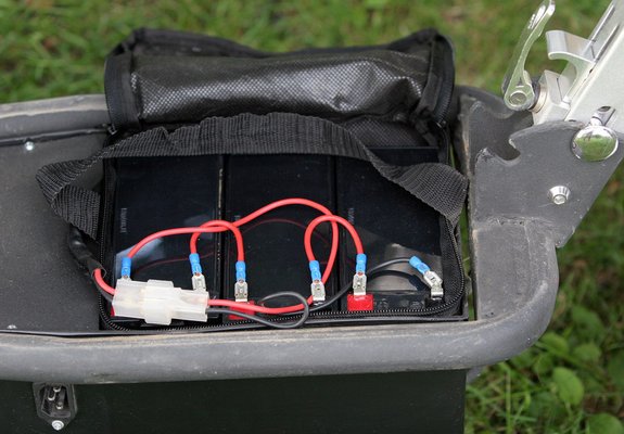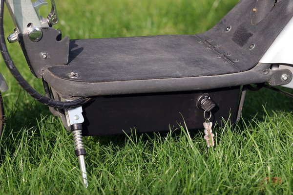 A 350 W teljesítményű villanymotort a hátsó kerék elé-fölé, a dizájnos sárhányó alá applikálták be, ahonnan fogazott ékszíjjal hajtja a hátsó kereket. A motornak három darab, sorba kötött, 12 voltos, 9 amperórás ólomakkumulátor adja az energiát. A töltésük történhet a rollerre szerelt dugaljon keresztül, de úgy is, hogy kiemeljük az eleve hordtáskába csomagolt akkuszettet, becipeljük a lakásba, és ott dugjuk töltőre. Persze, akkor már egyszerűbb az egész motort betolni az előszobába, de az meg hülyeség faluhelyen, ahol mindenkinek van garázsa, fészere, istállója, vagy valami udvari kalyiba, ahol a fűrészgép miatt nemcsak 220, de akár 380 volt is van.