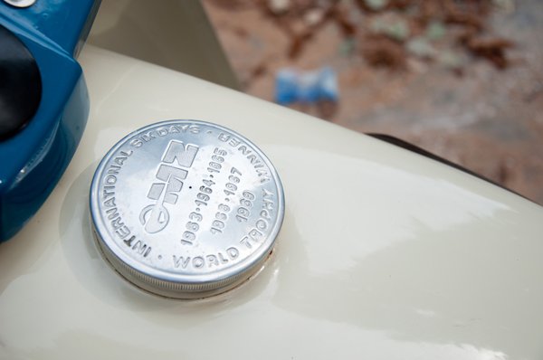 Egyik kedvenc részletem a stencillel fújt Trophy felirat. Annyira primitív és annyira bájos – ilyet is csak a szocialista gyártáskultúra engedhetett meg. Az egyszerű megoldást viszont ellensúlyozza a lámpamaszk oldalán levő régi MZ logó: a zöld, kígyőbőrszerű spirálka az NDK ipartörténetének egyik fel nem ismert csodája.