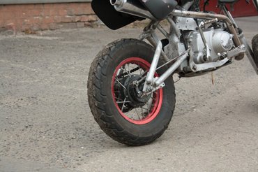 A benne lévő fekvő, egyhengeres, négyütemű motor egyébként pitbike építési kritérium. Ilyennel szerelik az összeset, az ősdonort pedig, a Honda Daxot, amiből az első modelleket építették, mindenki ismeri. Azóta elszaladtak persze a köbcentikben, hiszen először 90 és 100, majd 110, 125, nem ritkán 160 köbös piteket építenek. Az enyémben egy korai 110 ccm-es változat van: nem haldoklik még, de már nem tud olyan mérgesen pörögni, mint ahogy tudott valaha, a mostani modernebb, drágább verzióknak meg a nyomába sem ér.