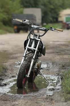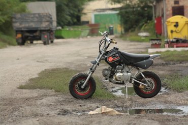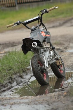 Ez egy pitbike, a műfaj őskorából: nagyon ügyetlen, rosszul összeszerelt, a minőséget kontinensnyire elkerülő, márkajelzéstelen, beazonosíthatatlan izé. Persze nem mindegyik ilyen. Vannak ebből csúcsszuper, minden hájjal megkent, versenyalkatrészekből, gondos kezekkel megépített modellek is, amikkel például nyolc métert lehet ugratni. Az én kis pitemnek egyetlen hálás tulajdonsága van: öt-hat év után is meg tud mozdulni.