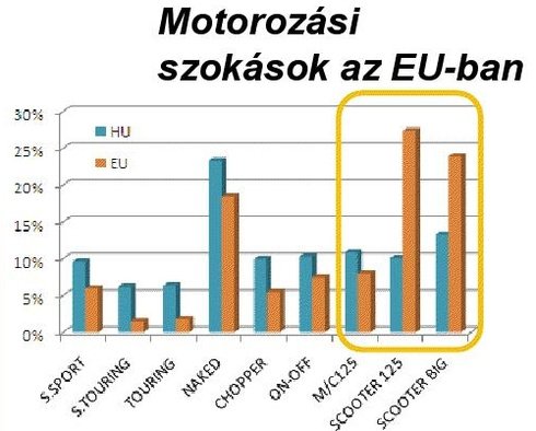A tavalyi eredményekkel összehasonlítva csökkent a sport és chopper/cruiser kategória jelentősége, viszont nőtt a mindennapi közlekedésre alkalmas gépeké: a tavalyi 29-ről 36 százalékra nőtt arányuk, ám az Európai Unió 53 százalékos részesedéséhez képest még van hova fejlődni. Az ottani népszerűség oka a mozgékonyság és a kétszer nagyobb városi átlagsebesség. A kis helyigény és az alacsony üzemeltetési költségek sem mellékesek. A jó eladások igazi oka azonban az, hogy rengeteg országban lehet B kategóriás jogosítvánnyal 125-ösöket vezetni.