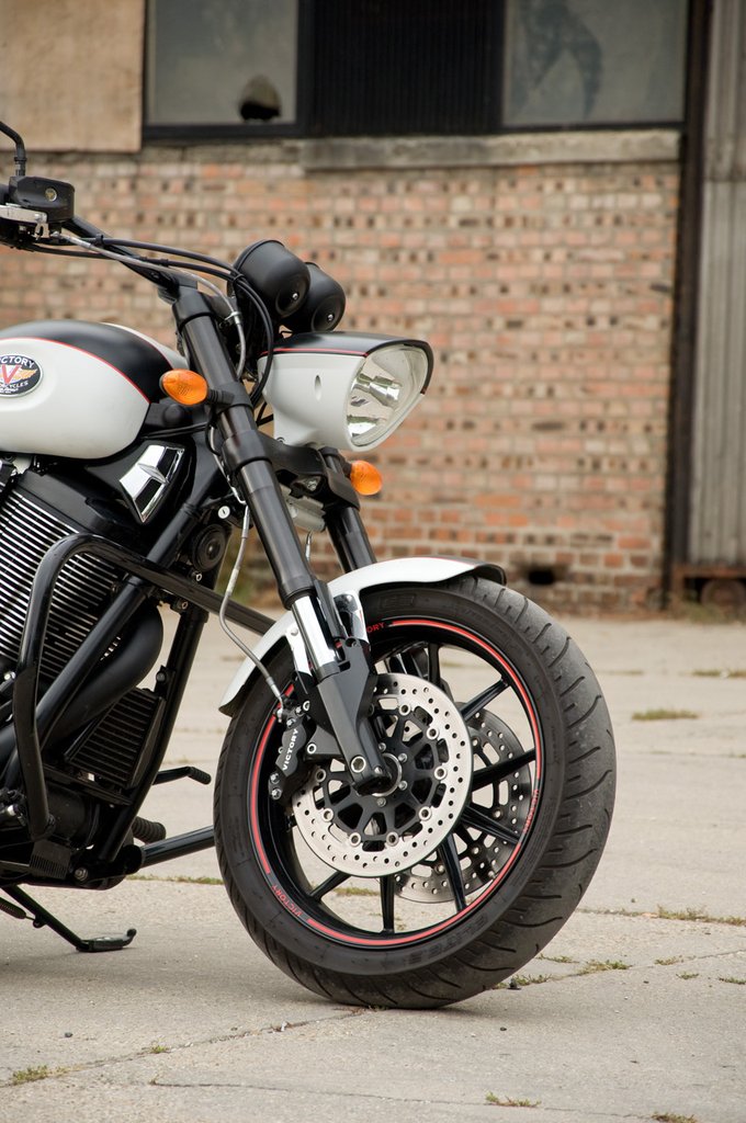 Mint minden motoron, ezen sem árt hátsó fékkel rásegíteni a lassú kanyarokra, ám legyünk óvatosak, elég hirtelen a 300-as tárcsára épített berendezés. A fék erejével nincs gond, csupán a reakcióit kell szokni – néhány napos barátkozás után már nem lesz probléma a finom adagolás. Az első, négydugattyús nyereg viszont kifogástalan: az ismert japán és amerikai cruisereké lényegesen tompábban viselkedik. Pozitív, hogy a hirtelen, nagy erejű lassításnál sincs bizonytalankodás; a három mázsa fölötti tömeget ugyan érezni, de a vaskos test ellenére barátságosan viselkedik a Victory.