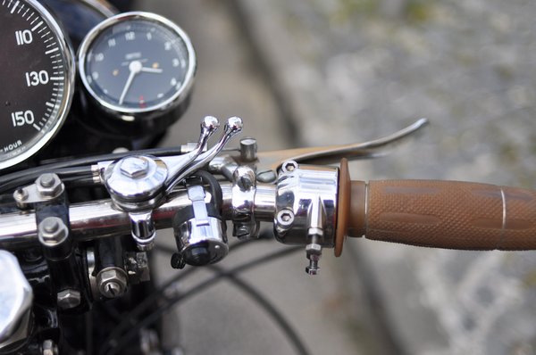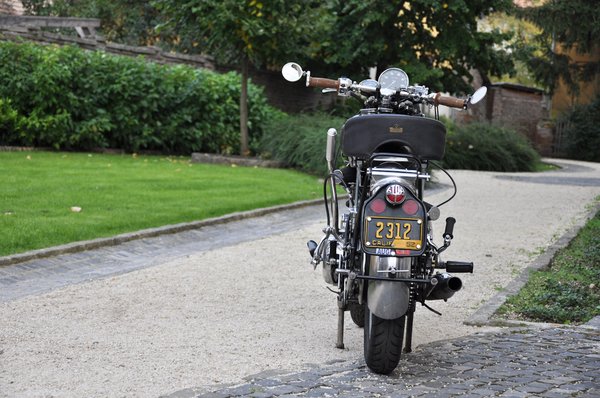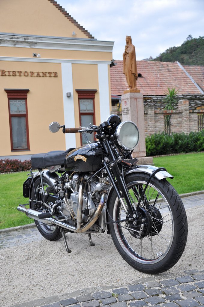 Az első kanyarnál óvatosan lassítottam. Laney említette, hogy egy holland barátja által fejlesztett kétszer kétkulcsos dobfék került a két szimpla helyére. Nem hinném, hogy sokkal jobb lett, de a tulajdonos esküdözik, a gyárinál lényegesen erősebb – azt hiszem, a gyakori karbantartást igénylő első villa mellett ez az egyetlen elem, ami megnehezíti a mindennapi használatot. Nem véletlen az angol café raceresek igyekezete: ők a zseniális blokkot valahogy belecsavarták a Norton Manx vázába és modern villát tettek alá. A Norvinek máig megbecsült és motorozható gépei a szubkultúrának.
