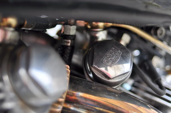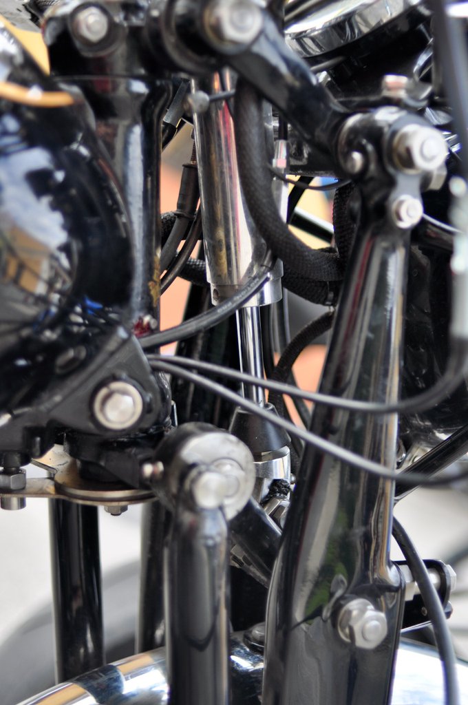 Az ő motorja persze már nem széria, Árpád ezt természetesen jobban kivesézi a cikkben, de én is látom. 12 voltos elektromos rendszer, elegánsan elrejtett önindító, Mikuni karburátorok – „egy szerelő barátom mondta, hogy jók, jók az eredeti Amalok, de ha motorozni akarok, ráadásul lerohadások nélkül, akkor tegyek fel két ilyet. Mivel az európai utat bő négyezer kilométeresre terveztem, ezért úgy döntöttem, elővigyázatos leszek. Nem is volt ezekkel baj” – magyarázza. A lengéscsillapítók Laney saját tervezésű darabjai, most a tizenharmadik variáció van fönn, de ezek már igen jók. Annyira, hogy néhány más Vincent is azóta ilyenekkel fut az USA-ban. Persze elektronikus gyújtás, halogén első fényszóró, ledes hátsó fényszórók és korhű házba foglalt indexek teszik teljessé az outfitet – „csak a biztonság kedvéért”.