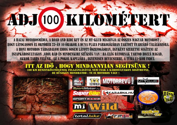 A segítség most két keréken érkezik! 2010.október 23-án 10:00-13:00 óráig évadzáró találkozó lesz a Duna Plaza előtt. Csatlakozzatok a kezdeményezéshez, és 100 km benzinköltségnek megfelelő felajánlással segítsétek a rászorulókat. 11:00 órakor egy csapata elindul Devecser felé, hogy személyesen legyenek a helyszínen az összegyűjtött adomány átadásakor.
