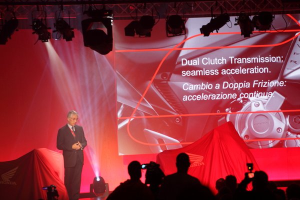 A Honda jól kiéheztetett minket, hiszen két éve pontosan itt, Milánóban állított ki utoljára bármit – azóta sem Európában, sem máshol nem jártak szakvásáron, talán Japánt kivéve, de az a mi szempontunkból mindegy. Akkor itt mutatták be a VFR1200F koncepcióját, a sajtókonferencia is ezzel az utalással kezdődött. Nyolc új modellt akarnak bemutatni: elképzelni sem tudtam, hogyan, de végül szépen összehozták.