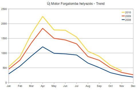 Szloboda Tamás szerint a nem regisztrációköteles robogók, quadok és krosszmotorok eladása nagyságrendileg épp annyira esett vissza, mint a rendszámos gépeké, amikről viszont pontos adatok vannak. A Datahouse összesítései szerint 2008-ban 7792 nagymotor kelt el, 2009-ben már csak 3609, az idén pedig november végéig mindössze 2220. 2009 után az idén is a Honda maradt az eladási toplista élén, ám ez kétes értékű győzelem. Azzal nyert, hogy kevesebb vevőt vesztett, mint a konkurensek. A Honda 2008-ban 1712 rendszámos motort adott el, 2009-ben 1106-ot, az idén november végéig pedig csupán 850-et.