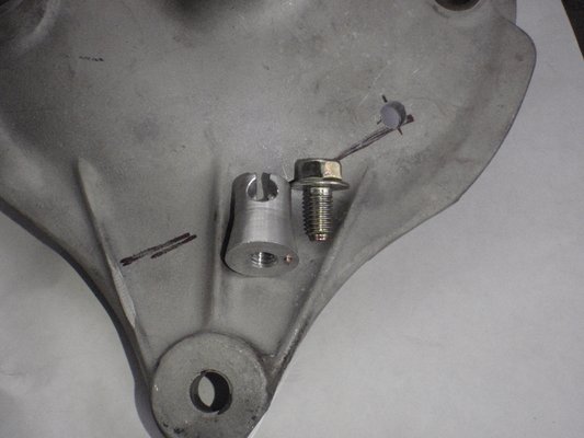 Térjünk át a hátsó fékre. A most bemutatott CB500T-n gyárilag rudazatos volt – ez nekünk nem felelt meg. Így esztergálunk egy bowdenház akasztó bakot, amit egy M8-as csavarral belülről felcsavarozunk a fékfedélre. Mielőtt felszerelnénk a felfekvő felületbe, fúrjunk bele 2 mm-es zsákfuratot, amibe elhelyezünk egy élesre elcsípett végű stiftet. Én ezt sima hegesztőpálcából szoktam készíteni. Mikor felszereljük a bowdenbakot, ez a stift belenyomódik a fékfedélbe, így megakadályozza az alkatrész elfordulását, fellazulását. Ugyanezt a módszert alkalmazom a váltókar és a hátsó fékkar taposó bütykénél is.