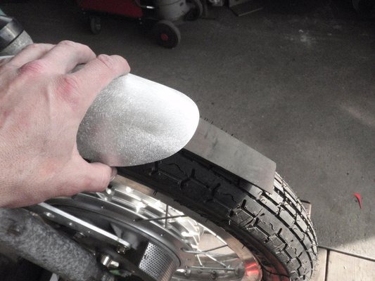 Most vegyük kézbe az első sárvédőnket. Segítségként tegyünk az abroncs futófelületére 10 mm-es gumilapokat. Ezek segítenek abban, hogy az abroncs és a sárvédő között mindenhol meglegyen a kellő távolság. A kis szamárvezetőkre ültessük rá a sárvédőnket, majd jelöljük ki a felfogató csavarok furatainak a helyét.
