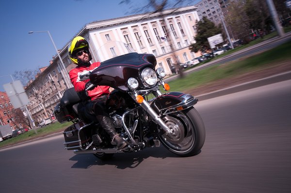 Városban érdekes módon a Harley sokkal ügyesebbnek érződik, mint a Honda Gold Wing, amit érezhetően arra fejlesztettek, hogy a tulaj lenézhesse a Harleysokat, de kicsit túl jól sikerült. Az Electra Glide igazából szélesebb (965 mm), mint a Gold Wing (945 mm), mégis jobban be merek vele menni autók közé. Ügyes tehát, amíg fékezésre nem kerül a sor. A fékekkel nincs is baj, mert az első is elég jól fog, elöl-hátul ABS, ami nekem kicsit otromba működésűnek tűnik, de darabra megvan. Aggódni tehát nem kell, egy vészfékezés nem jelent látványos zakózást. Viszont a motor a puha rugó és lengéscsillapító miatt óriásiakat bólogat, és ha nem nyílegyenesen vezet az utunk, az duplán rossz.