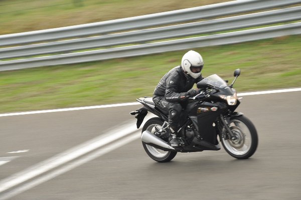A kevesek egyike vagyok, akik bánkódnak azon, hogy eltűntek az egyhengeres sportmotorok. A Gilera Nuovo Saturno ma már csak emlék, a piacról kikoptak a magától értetődő, könnyen vezethető kis bolhák. A bemutatón nagyon találóan fogalmazott egy hondás: inkább ilyennel élvezkedne a kakucsi törpe pályán, mintsem egy ezressel a szent Hungaroringen – annak ellenére egyetértek vele, hogy ez a CBR inkább csak külsejében adja meg a sportosság illúzióját.