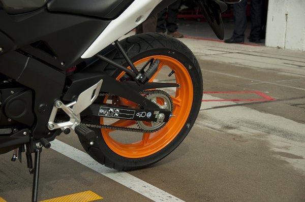 Elöl-hátul 17-es felniket kapott, melyekhez 110-es és 130-as gumikat párosítottak. A kétdugattyús féknyereg és a 276-os tárcsa megbirkózik a motorral, de kicsit határozatlanabb, mint kéne – a 250-es nagytestvérről átülve szembetűnő volt a különbség.