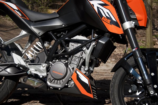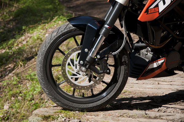 Korábban már beszámoltunk arról, hogy az indiai Bajaj KTM részvénycsomagot vásárolt – ennek eredményeként ez az első motor, amely koprodukcióban, részben Ázsiában készül. Számos olyan alkatrészt találunk, amely minőségéhez egyelőre kevesek a kintiek: többek között ilyen a szépen megmunkált felső villahíd.