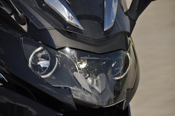 Az első kerék felett bekukkantva megvizsgálhatjuk a Duolever rendszerű rugózást, a villaszárak helyett lengőkarral és központi rugóstaggal megoldott első futóművet. Ha bekukkantás közben vicces barátunk bekapcsolná az indexet, le is barnulhatunk, olyan brutális erővel világít a két LED-sor. Kapunk alulra két ködlámpát, melyek nyilvánvalóan nem a ködhöz kellenek, hanem a karácsonyfaszerű megjelenéshez, és van egy új, analóg, de okos fejlesztés: az idom tetején kihajthatunk két légterelőt, amivel melegebb időben hűthetjük a nadrágunkat. Augusztusban jól tud jönni az ilyesmi, mert a szélvédett túramotorokon meg bír ülni a forróság.