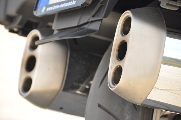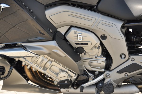 A szebbik nézete a jobb oldal, innen az egész hengert láthatjuk, és mivel a gyártó nem szégyelli a hengerszámot, raktak rá egy nagy, krómozott 6-ost. Baloldalt a vízcső kicsit eltakarja a hengerfejet, úgyhogy ott a váltóra rakták a számot, nehogy valaki kétségek között őrlődjön. A közismert BMW-s szerénységgel és visszafogottsággal sikerült a kipufogókra is 3-3 kiömlőnyílást rakni, nehogy feledésbe merüljön a hengerszám.