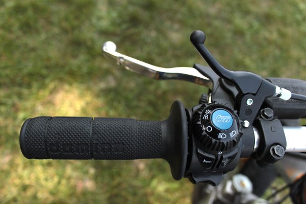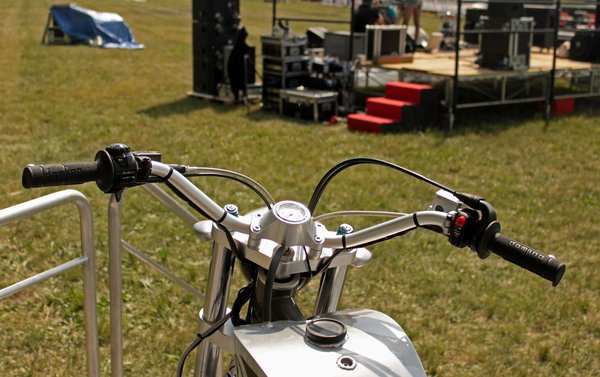 Szinte elvész alattam az apró, penge szélességű motorocska. Üléspozíciója hasonlít a prototípushoz, a különbség csak annyi, hogy magasabban ülünk. A hetvenes éveket idéző endurókormány retró hangulatot ad. Amikor próbaútra indultam, Paolo rám mosolygott és csak annyit mondott: „Légy gyors és fordulj balra!”