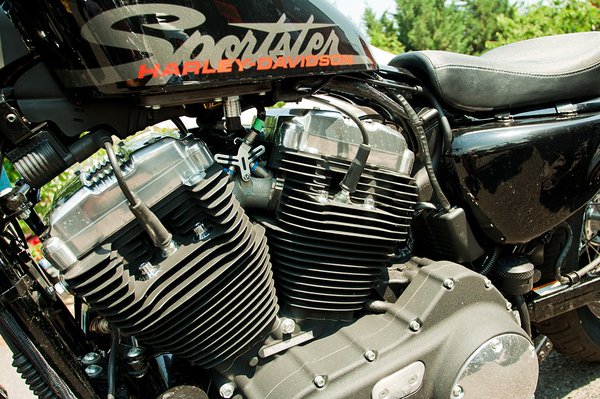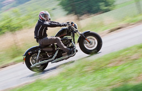 Vicces, ahogy a szelepek csattognak a lábunk között, a V2-esnek kellemes, de nyers hangja van. Fordulatszámmérő természetesen nincs, akkor kell váltani, ha a csizmánk már rezeg, utána ugyanis hamar elfogy az erő. A motor ereje pont kellemes, a Sportster vagány neve ellenére nem speedmotor, de azért nagyon szépen gyorsít nyomatékból gyakorlatilag minden fordulatszám-tartományban.