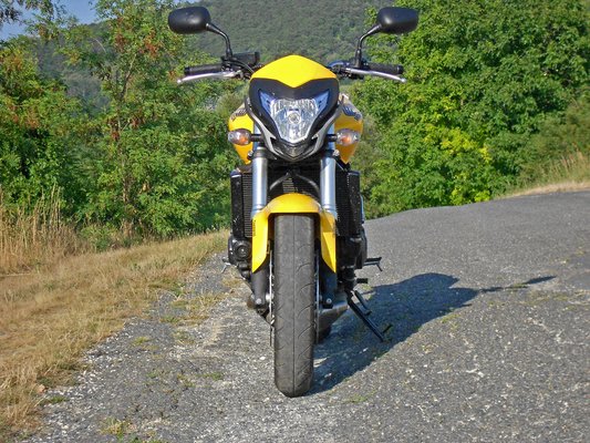 A 2011-es modellfrissítés úgy fest, mintha egyszerűen rárakták volna a CB 1000 R fejidomát, meg a CBR 600F farát. Valószínűleg ezt is csinálták, de fáj ez valakinek a Yamahán kívül? Egészében gyönyörű, részleteiben nagyrészt olyan, mintha egy vízvezeték-szerelő dobta volna össze, de hát annyi baj legyen, nem kell közelről nézegetni. Ez a sötét sárga-metál nagyon ott van, és kész, mi kell több egy tömegmodellre? Az ülés kemény, de kényelmes, a tank jól formázott, tökéletesen lehet combbal szorítani. Szerencse, hogy az üléspozíció egyáltalán nem olyan, amilyet az ember elképzelne így ránézésre, hanem normális, egyenes naked bike-testhelyzet.