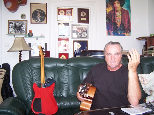 A beszélgetés eleje óta először teszi maga mellé a legendás piros szólógitárt és játssza le kezeivel az ismerős motoros mozdulatsort.