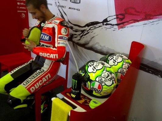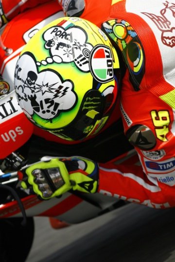 Az AGV-t idén is Valentino házi képzőművésze, Aldo Drudi festette le. A grafika telitalálat, hisz az ábrázolt gondolatokat kimondatlanul is mindannyian ismerjük - az indulatokhoz még egy Ducati versenymotor sem szükséges.