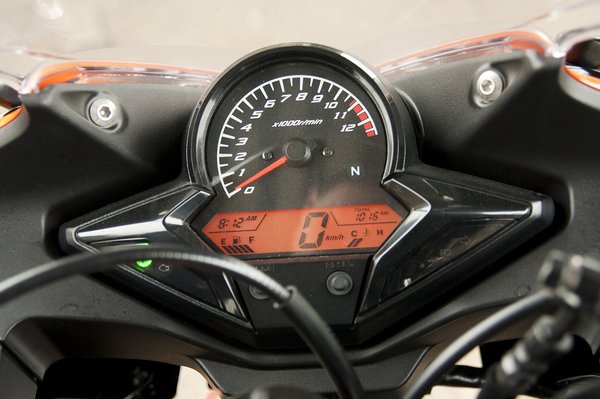 Azt nem tudom, hogy miért kellett még a gyújtáskapcsolót is rondára csinálni, szerencsére van igényesen megcsinált dolog is az ember szeme előtt: a műszeregység, ami egy az egyben olyannak tűnik, mint a CBR250R-é. Szép nagy analóg fordulatszámmérő, az összes többit a digitális kijelző mutatja, sőt, rendes tankszintmérő is van, ami egy alapszintű motornál igazán kedves dolog. Egy kósza bovdent persze sikerült úgy elvezetni a műszer előtt, hogy nekem pont kitakarta a bal oldali index visszajelzőt. Csak az üres kapott jelzést, a többi fokozat nem, de aki már ennél a motornál sem érzi, az megérdemli.