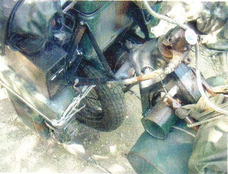 Most a nagyfeszültségű vezetékeken dolgozom. Az első kerék agyába épített áramfejlesztő táplálja a váz mellé, a kis hengerbe szerelt elemeket. Van itt egyenirányító is.