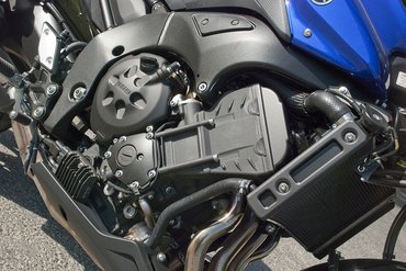 Könnyebb a főtengely, módosult a hengerfej, az eltérő hosszú szívócsövek és a bőven szabott leömlők is az alacsony fordulatú motorozást támogatják. Persze van benne kraft, hisz akárcsak a Suzuki, hétezres fordulat körül megvadul és izgatóan ront előre – ereje viszont papíron ugyanannyi mindkét konkurens nakednek. A nyomaték eloszlásában viszont van különbség – a Yamahánál leheletnyivel hamarabb térnek magukhoz a newtonméterek.