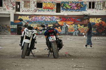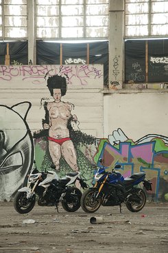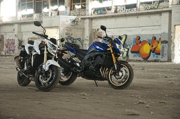 A Yamaha FZ8 és a Suzuki GSR750 egymás mellett pózol. A graffitis falak és a kikötőből szálló gépzsírszagú levegő furcsa keretet ad a két, alapból utcára szánt motornak. Formatervezésük harcias, ugyanazokkal az eszközökkel próbálják elhódítani ugyanannak a célcsoportnak a pénzét.