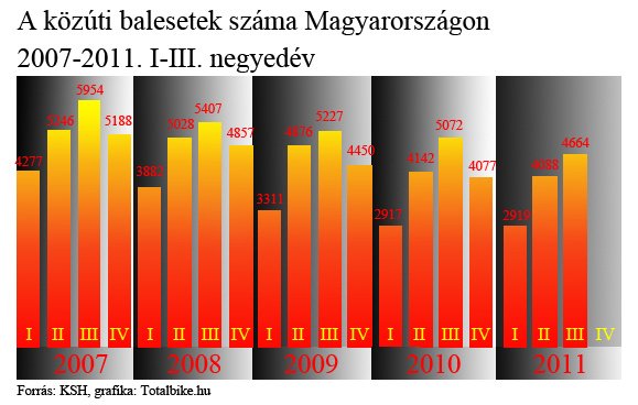 Az áldozatok száma csupán a negyedik negyedévben volt magasabb, mint 2010. adott negyedévében, a halálos kimenetelű balesetek száma ugyanis az előző év azonos időszakához képest 6 százalékkal nőtt. Ezzel együtt 2011. negyedik negyedévében 3 százalékkal kevesebb személysérüléses közúti közlekedési baleset történt a közutakon, mint az előző év azonos időszakában. Mind a súlyos sérüléssel járó balesetek, mind pedig az ittasan okozott balesetek száma jelentősen csökkent.