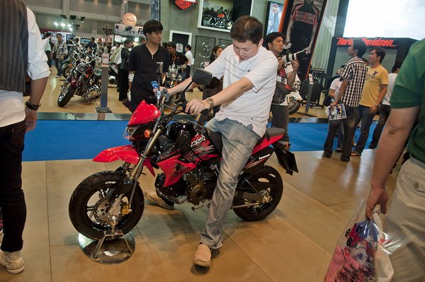 Zömmel ázsiai márkákat állítottak ki. Ahogy a tavalyi prospektust elnézem, idén kevesebben jöttek Európából. Amerikát a HD képviselte, nekik eléggé bejött a kinti piac, Kína és India burzsoá rétege is rájuk esküszik – Bangkok utcáin alig láttam nagymotort, de azok zöme Harley volt.