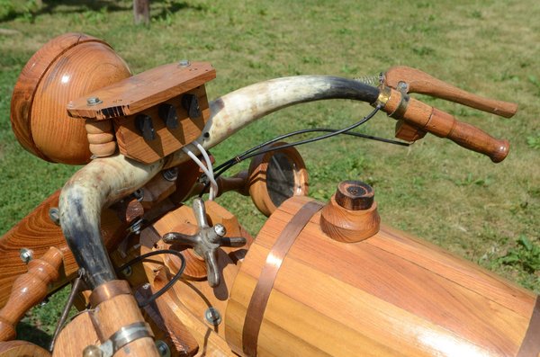 Az üzemanyagtankot hordóból, a kormányt és a kipufogót szürkemarhatülökből alakította ki, díszítésként pedig őzagancsot használt. A gumik és a motorblokk kivételével mindent Puskás István készített.