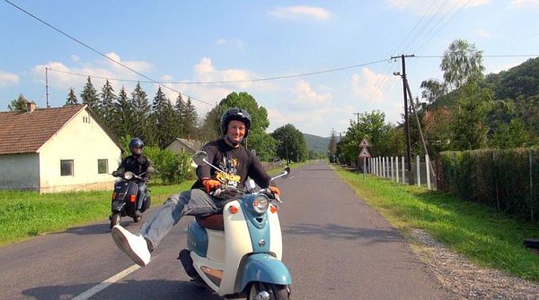 A házigazdák kajával vártak, így életben maradtunk. Alkoholt én csak elvétve iszom, így részemről nagy dajdajozás nem volt. Másnap reggel az volt a tervem, hogy majd lesz valami. Úgy gondoltam, motorozni kéne, meg elmenni a robogós idióták elé. Zách Dani annyira kattant a Vespájával, hogy akkor is szimpatikus lenne, ha egy talicskát imádna ennyire. Képes volt rávenni a fél TC szerkesztőséget, hogy robogóval jöjjenek: Csikós az asszony Vespájával, Göbi pedig a nemrég beszerzett Vinójával. Bizonyította, mit tud egy jó 3KJ blokk, de Piros Ádám Piaggio Typhoonja is elég döbbenet, mert egyrészt 25 ezer km-el az órájában zsír jól néz ki és kibírta a 230 kilométeres utat, másrészt elgondolkodtató, hogy mennyi lehet a roncs állapotban levő példányok órájában valójában, ha ez 25 ezerrel volt ilyen.