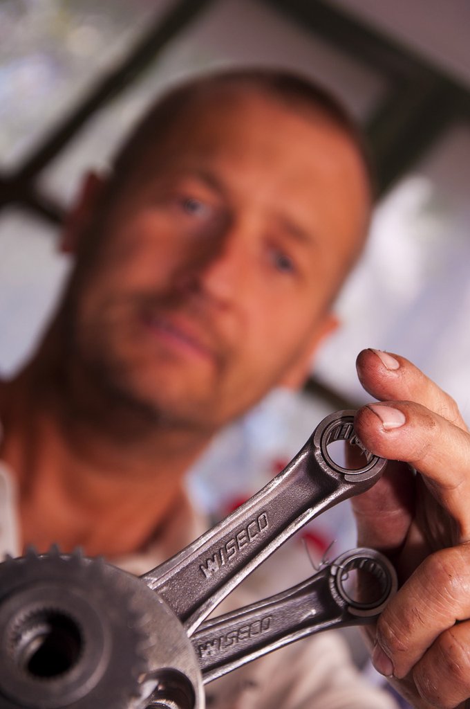 "Ha tehetem, Wiseco dugattyúkatt használok, de a hajtókarjaik is nagyon jó minőségűek. Idehaza nincs, senki nem rendeli be, ebay-en kell vadászni, kovácsoltat, krómgyűrűkkel. A speciális és ultrakönnyű kipufogót Kutrik Zsombor tervezte, 0,8-as rozsdamentes acélból Mohai Jánosék kivitelezték – gyönyörű lett, nem?”