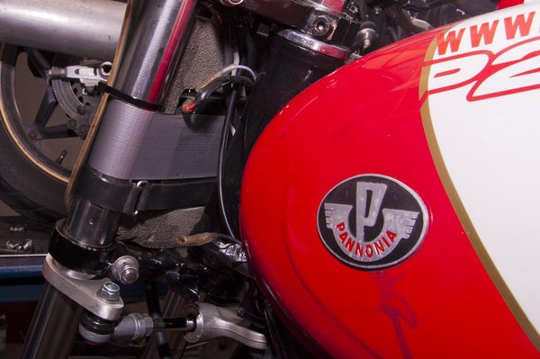 Mindkét kifli P20-ról van, de a felső is egy alumínium alsó darab – a gyárival nem lehetne beljebb ültetni a szárakat. Mivel az ETZ teleszkóp átmérője kisebb, esztergált persellyel lettek befogatva. A kormány T5-ről van, ez jobban passzol a testalkatomhoz, mint a német darab.”